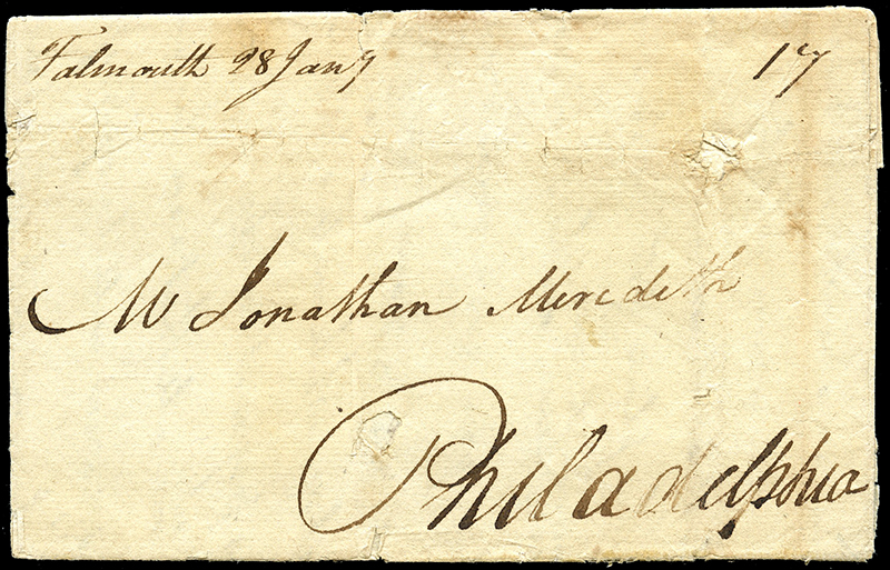 1796 Folded transatlantic letter ms "Falmouth 28 Jany", to Philadelphia (USA), favoured to New York, minor faults. (Image)