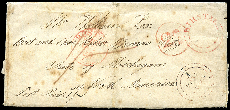 1844 Folded transatlantic letter, red BRISTAL undated, via LEEDS 20 SEP 1844 F, red BOSTON SHIP OCT 20 to Monroe Michigan, rated ms 1/, with SCARCE red '27' in circle handstamp, oval L SE 21 A on reverse, toned and