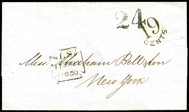 1850 Folded transatlantic cover, London LS 11 JA 11 1850 Maltese Cross, to New York (USA), 19 Cents (unpaid) and 24 (collect) handstamp, carried by Cunard "Niagara", opening tears, appears very fine. (Image)