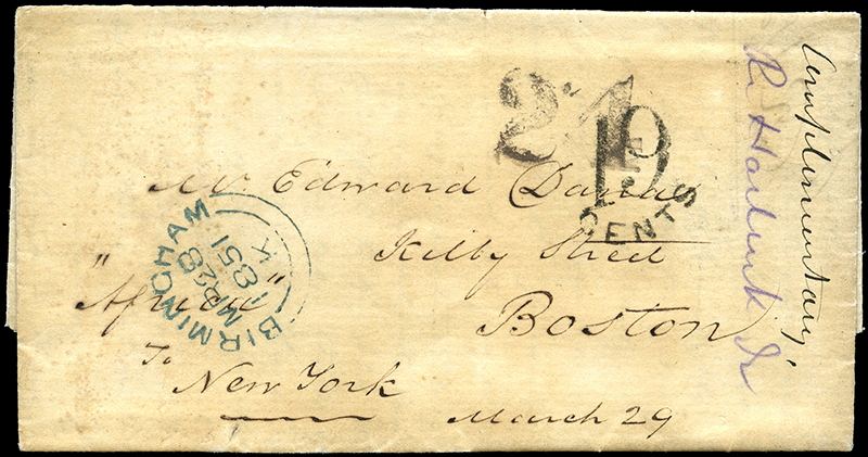 1851 Folded transatlantic letter, blue BIRMINGHAM 28 MR 1851 K, to Boston (USA), 19 Cents (unpaid) and 24 (collect) handstamp, carried by Cunard "Africa", straight line FIVE-WAYS (Birmingham Postal collection