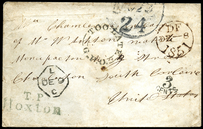1851 transatlantic cover, T. P Hoxton 2 line straight line, DF DE - 8 1851, hexagon L DE 9 C, and TOO-LATE G.P.O handstamps, to Charleston United States, 3 CENTS, and NEW YORK SHIP 23 DE 23 with large 24 (cents collect)