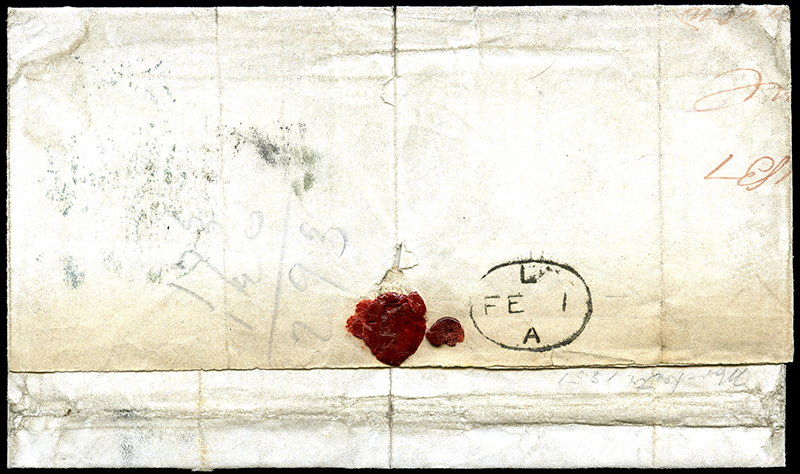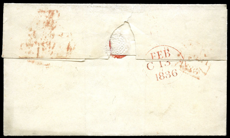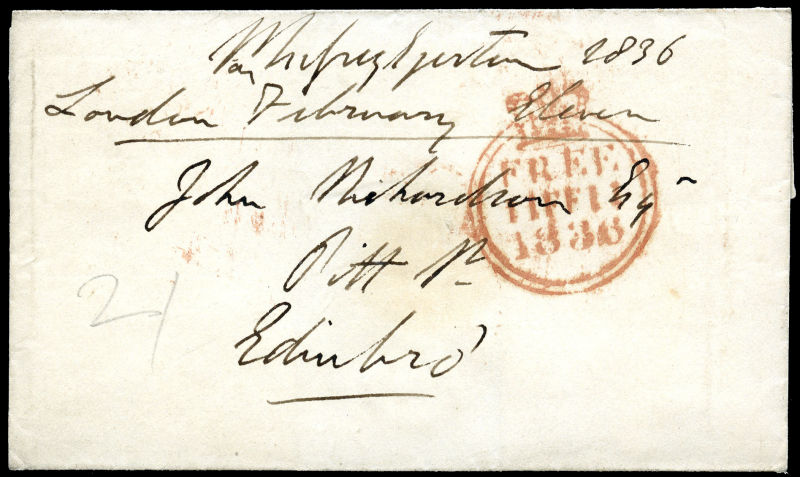 1836 folded cover, ms 'London February eleven 1836', red CROWN FREE 11 FE 11 1836 hand stamp, to Edinburgh, red FEB C 13 1836 receiver.