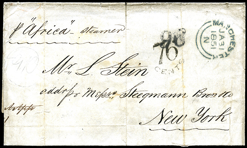 1851 Folded transatlantic invoice, green MANCHESTER 31 JA 1851 N, rated 76 CENTS and 96 handstamps to New York (USA), oval L 1 FE A, ms ‘p “Africa” – Steamer’, grubby and filing folds. (Image) (imagea)