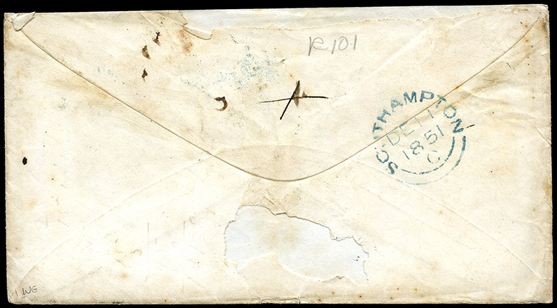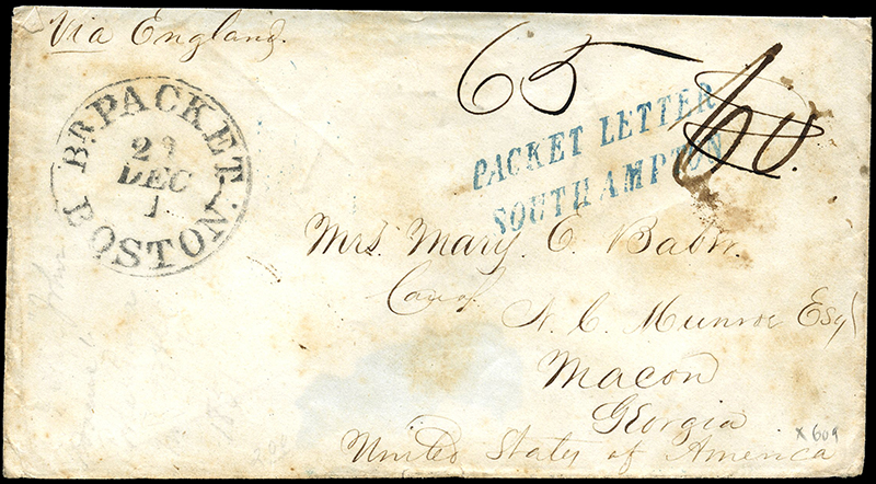 1851 transatlantic cover, green 2-line PACKET LETTER SOUTHAMPTON, and SOUTHAMPTON 11 DE 1851 C (on back), ms ‘Via England’, rated 60 and crossed out re-rated 65 carried by Cunarder Canada, to Macon Georgia Untied States of