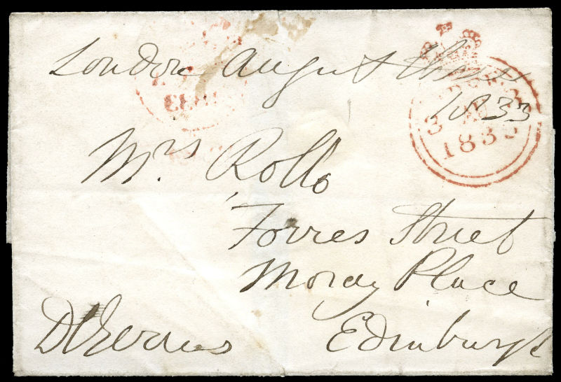 1833 folded cover, ms 'London August three 1833', red CROWN FREE 3 AU 3 1833 hand stamp, signature LL, to Edinburgh, filing folds, small part missing where wax seal was. (Image)
