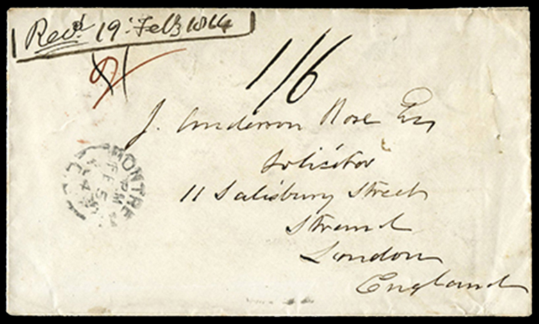 1864 Trans-Atlantic cover from Montreal 5 FE to London, red ms ‘2’ (Cdn claim) later corrected to ‘4’, a double letter claim (ignoring half unpaid fine, claim should be ‘7’, unusual), sent via closed bag through Portland, ME, rated
