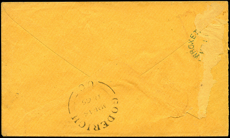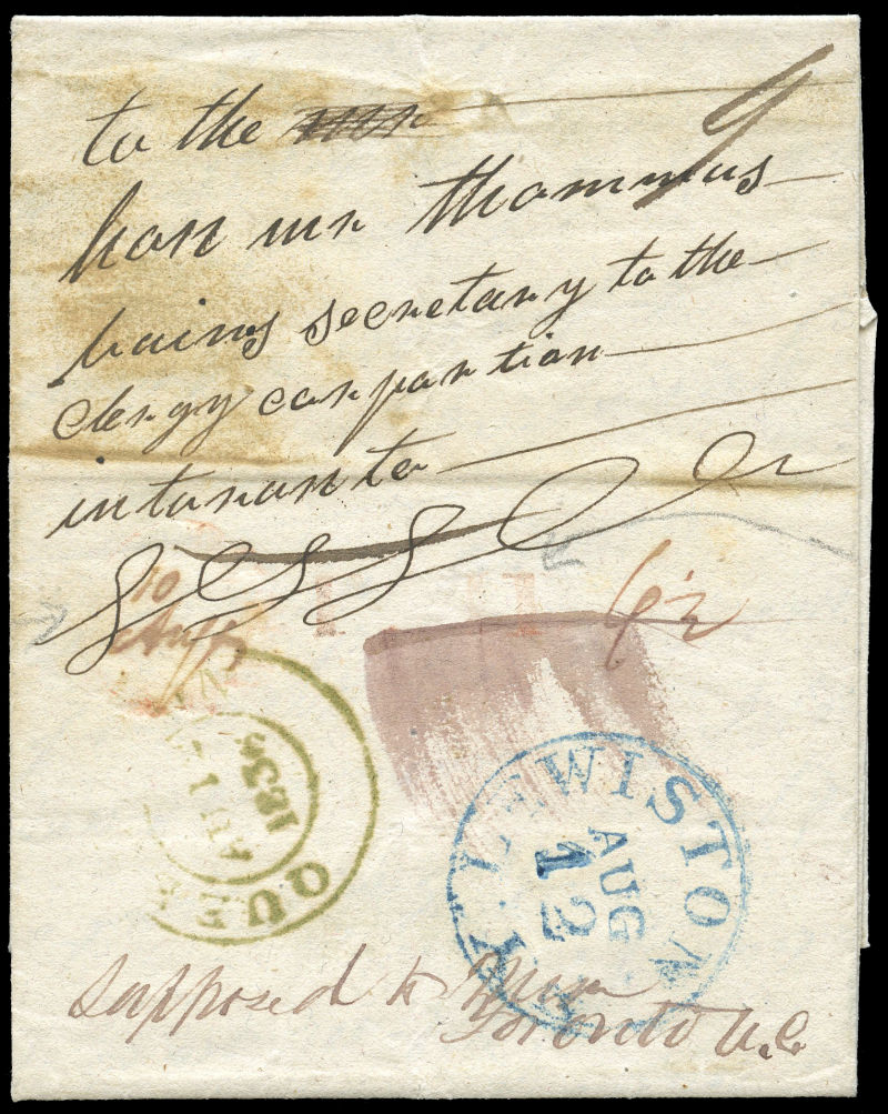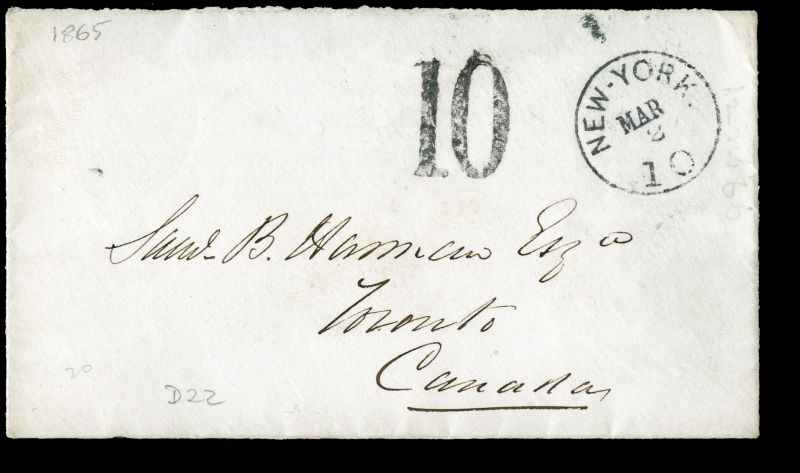 1865 Small cover, NEW YORK MAR 3 “10” single 23mm ring rated transit, rated large 10 (d cy) (Arnell D22) for Transatlantic via US, partial TORONTO MR 3 65 C.W broken circle receiver, Possibly carried Inman “Edinburgh” to