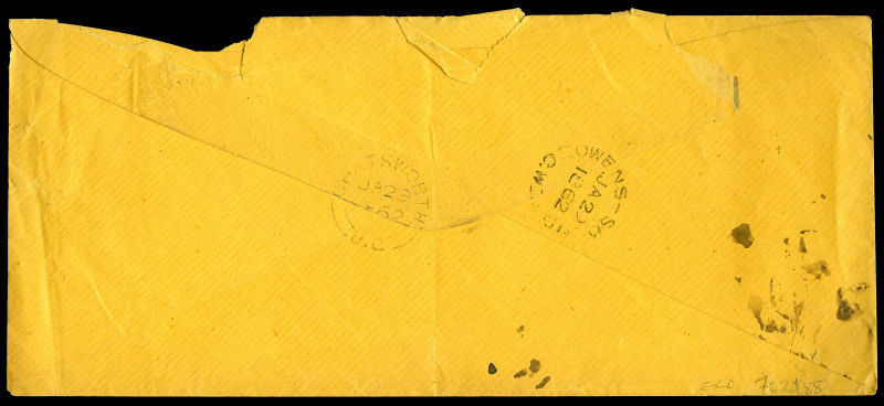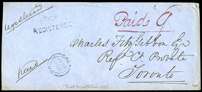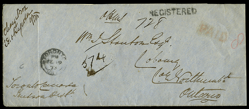 h/s in black above PAID h/s in red with m/s 8 in red. [2x3¢ double rate plus 2¢ registration fee] . Registration Nos 728 and 574. To Wm J Stauton Esq, Cobourg, Co Northumberland, Ontario. No receiver, but annotations on back. Envelope opened at top
