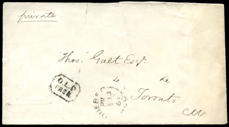 1861 Stampless CROWN LAND DEPT on small envelope from QUEBEC LC FE 13 61 small single split circle, boxed C.L.D FREE in black (Davis DCL-1), rated FREE h/s in black all on front, Toronto split circle receiver on back,