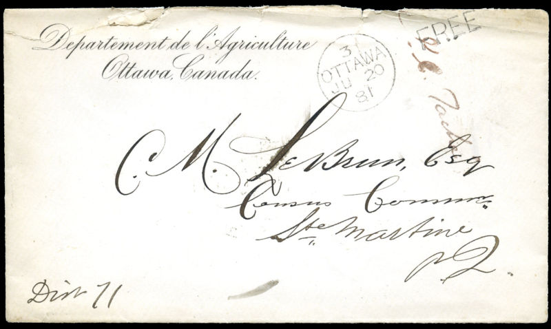 1881 DEPARTEMENT DE L’AGRICULTURE on small cover JU 20 81 with OTTAWA FREE DUPLEX (DON-1206, 8mm) to Ste. Martine Quebec. Joseph Charles Tache SIGNATURE Deputy Minister of Agriculture, opening tears, otherwise very