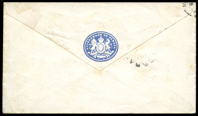 1873 Stampless REGISTERED blue envelope. TORONTO ONT PM FE 17 73 enclosed broken circle date stamp in black. Endorsed m/s “OHMS” and “Charge Box 281& Ryerson + initials” at UL, “Toronto Canada Pension District” at LL. REGISTERED