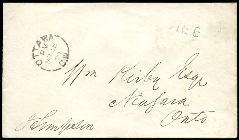 1870 GOVERNMENT OF CANADA on small cover, MR 18 70 from Ottawa, FREE, to Niagara (receiver). SIGNED by John Hall Thompson MP, representing Ontario North in the 1st Parliament, very fine. (Image) (imagea)