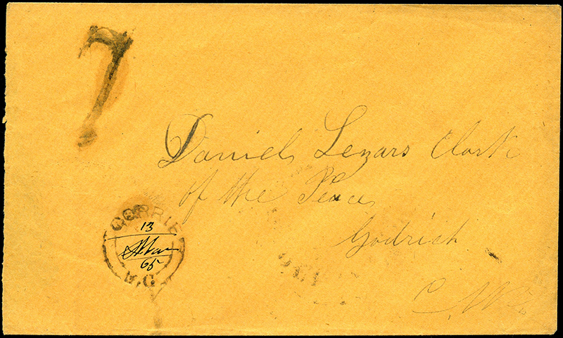 1865 Cover, unpaid 7, GORRIE U.C, 20mm double broken circle Berri hammer, ms 13 Mar 65 to Quebec backstamp. This postmark is from the Berri order of 1857. Huron County. Oily markings due to ink mixture otherwise very fine.
