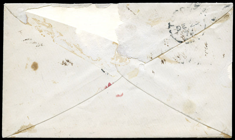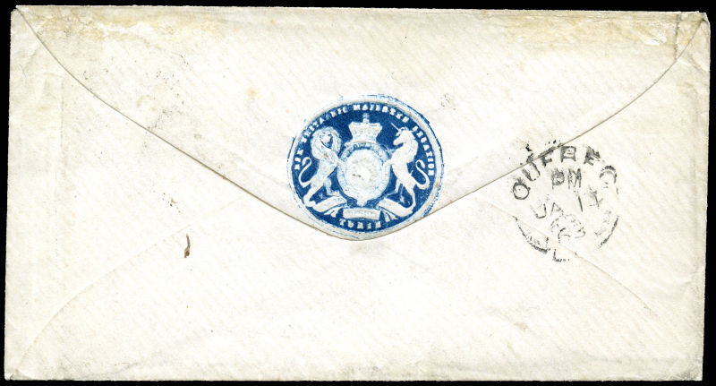 1862 Attractive transatlantic stampless envelope with blue Coat of Arms seal on backflap, sent unpaid on the Allan Line's 'Nova Scotian' from London 20 DE to Quebec, 11 JA '83 receiver on back, with ideal strike of RARE RATE