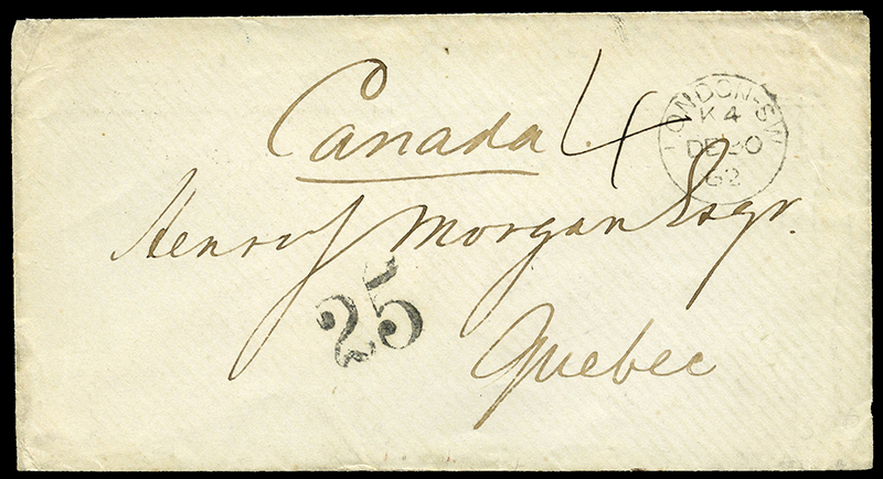 '25' handstamp (12½¢ Cdn Packet rate plus 12½¢ penalty for unpaid, total of 25¢) plus manuscript rate '4' (d stg) due to GB (1d of the 6d ship rate plus 3d or half of the unpaid fine), clean and very fine, a rare and desirable rate cover. (Image) (imagea)