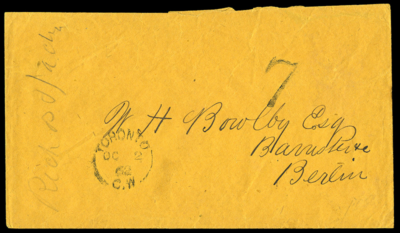 1862 Manila envelope from TORONTO 2 DE to Berlin, C.W. with rate mark '7' (¢ unpaid), next day receiver on back, slight backflap damage, still fine.