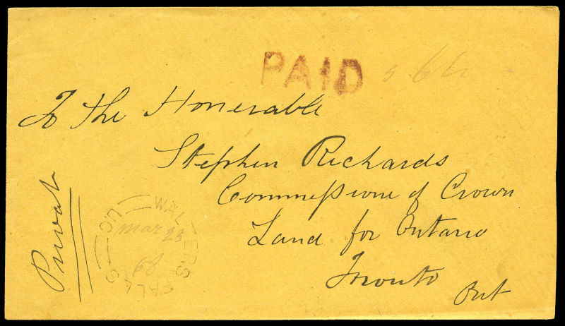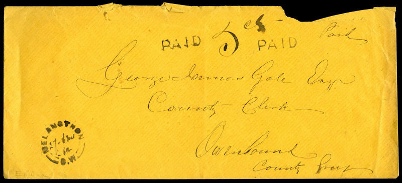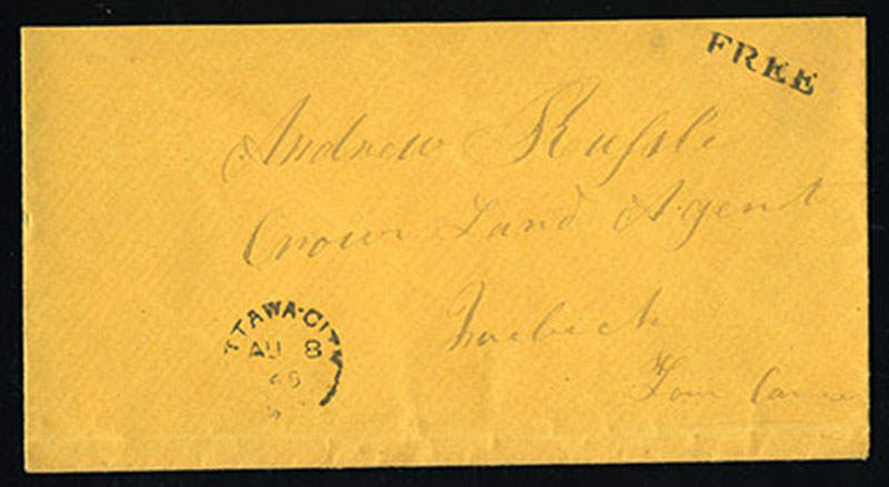 1883 Yellow envelope with Ottawa 15 AU '83 straight line 'FREE' duplex and MP signature stamp top right, trimmed at left and a few light cover faults/age spots, otherwise fine. (Image)
