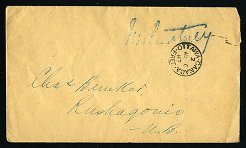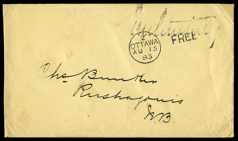1887 Stampless envelope with very fine strike of OTTAWA-CANADA-FREE 6 AU cds to Rushagonis, NB, with blur MP signature stamp top right, minor cover bends/opening faults and a few light ink spots on back, otherwise fine. (Image)