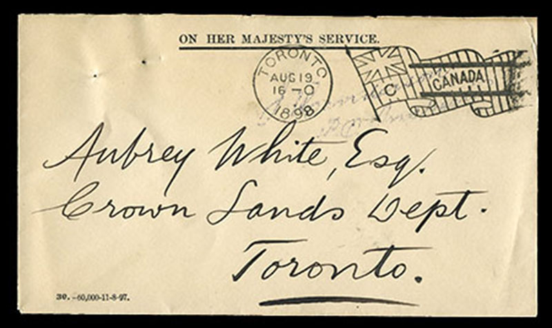 1898 'ON HER MAJESTY'S SERVICE' printed official envelope with very fine strike of 19 AU TORONTO 'C' FLAG (Richardson type 8-19), with light violet 'PO Inspector' handstamp underneath cancel, sent free to the Crown Lands Dept, in