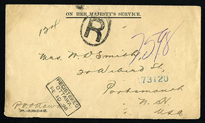 1898 'ON HER MAJESTY'S SERVICE' printed official envelope with very fine strike of scarce boxed REGISTERED OTTAWA 10 FE '98 handstamp to USA, with two additional boxed strikes on back as usual plus Montreal 10 FE squared circle
