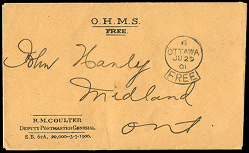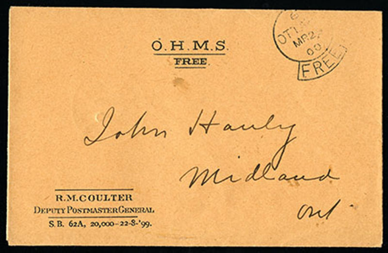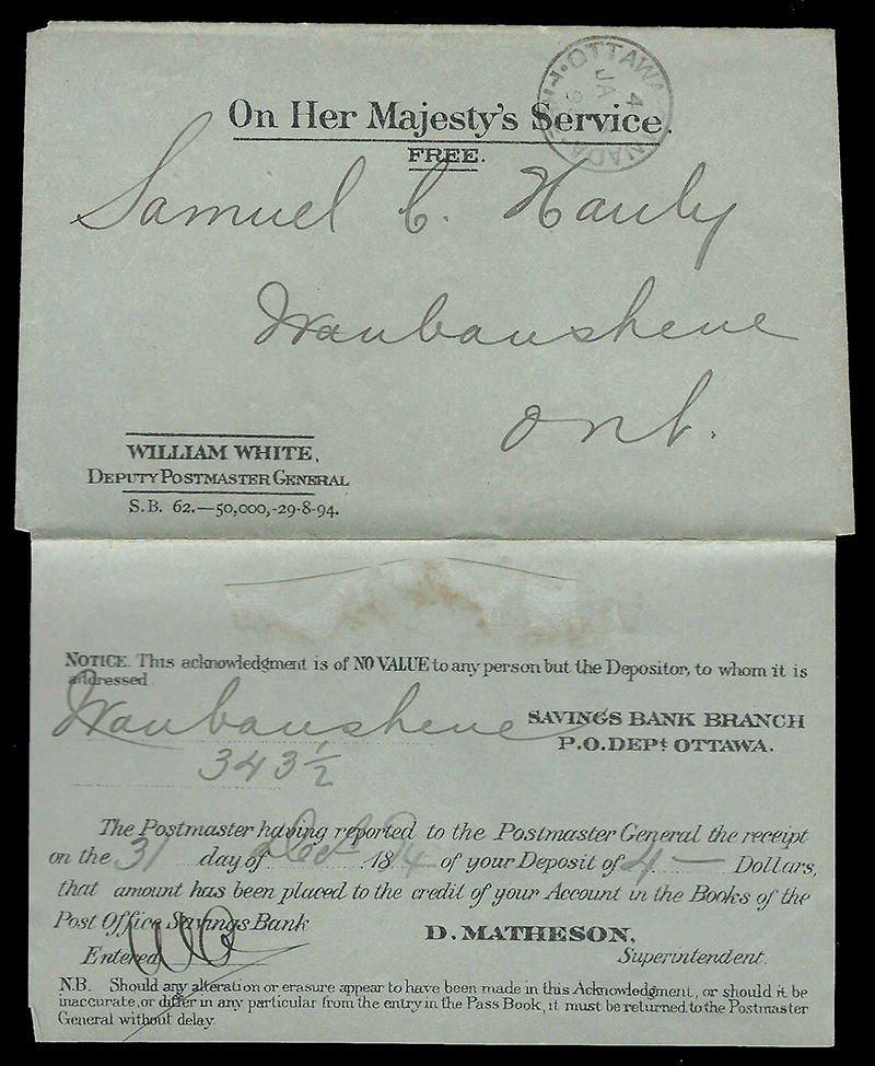 1900 Folded orange pre-printed O.H.M.S. FREE / Deputy PMG POST OFFICE DEPARTMENT SAVINGS BANK acknowledgement of deposit form with OTTAWA FREE 14 SP cds dispatch to Midland, 30 MR receiver on back, very fine. (Image)