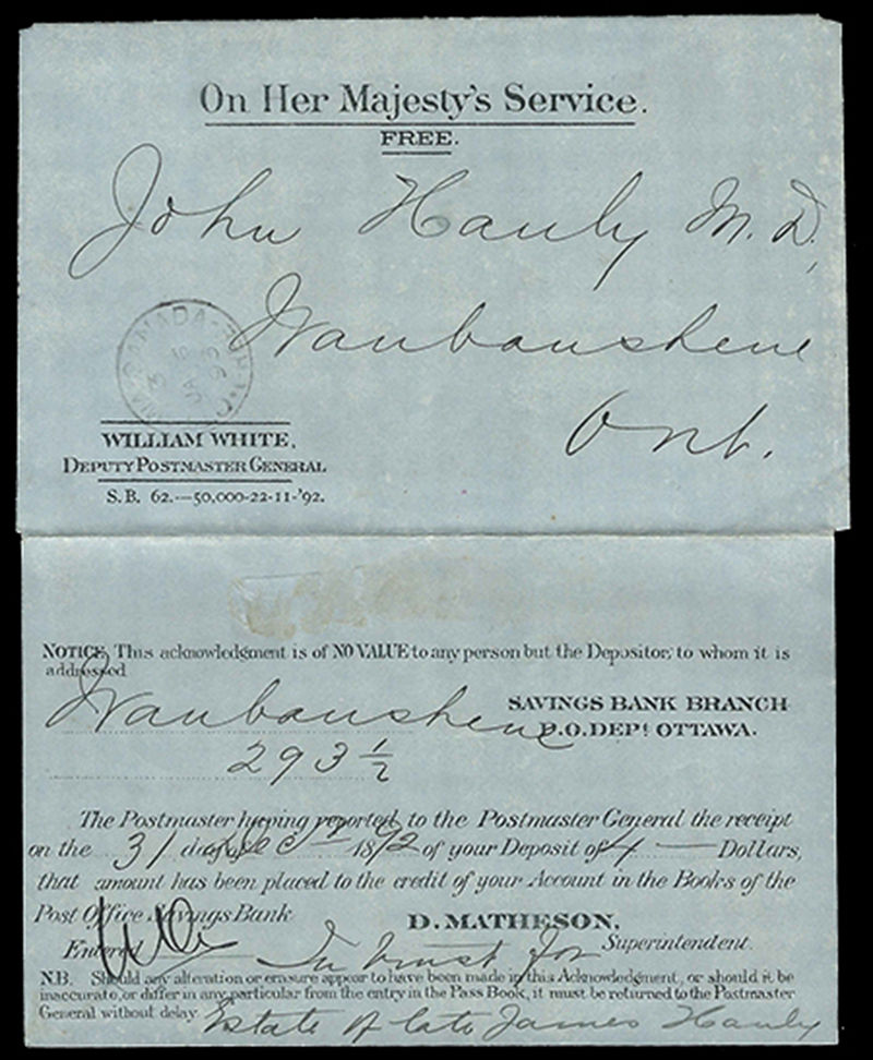 1895 Folded blue pre-printed On Her Majesty's Service FREE / Deputy PMG POST OFFICE DEPARTMENT SAVINGS BANK acknowledgement of deposit form with OTTAWA-CANADA-FREE 6 JA cds dispatch to Waubaushene, fine and scarce. (Image)