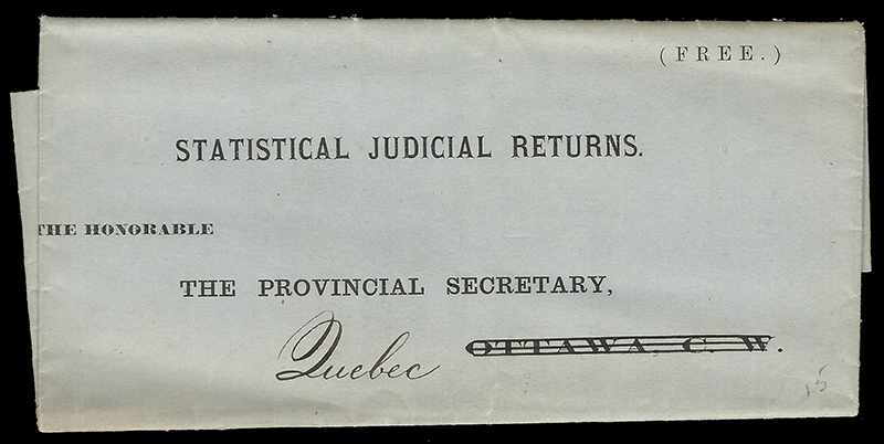1868 Folded printed STATISTICAL JUDICIAL RETURNS form for the year 1867 for the Circuit Court at Chateauguay, sent FREE to the Provincial Secretary at Quebec, internally dated January 20, clean and very fine. (Image)
