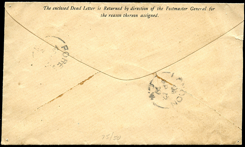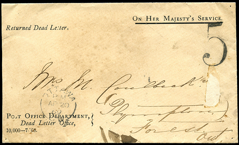 1869 Returned Dead Letter, ambulance cover OTTAWA 20 AP 69 C.W., rated 5(¢) collect hand stamp, LONDON 22 AP 69 C.W. transit, and FOREST C.W. AP ? receiver, POST OFFICE DEPARTMENT, Dead Letter Office, 10,000-
