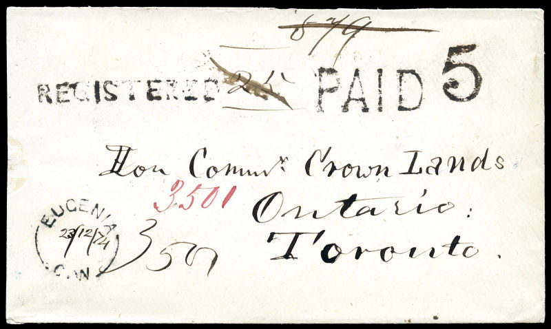 1874 Registered cover, EUGENIA C. W split ring 23)12(74 manuscript, to Toronto, large 'PAID 5' and 'REGISTERED' hand stamps, 23 DEC 74 receiver, part of back flap missing. (Image) (imagea)
