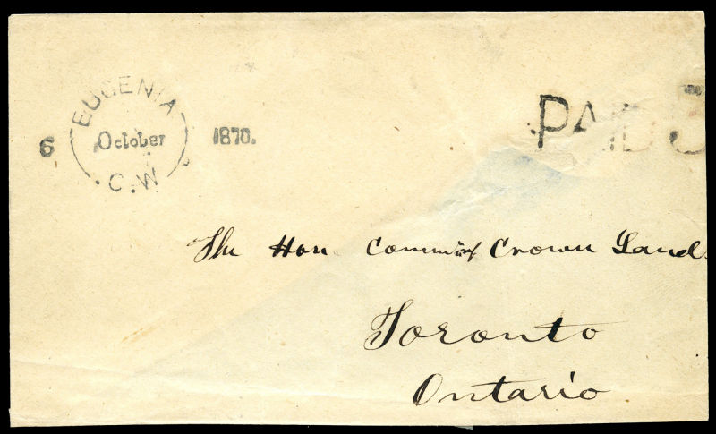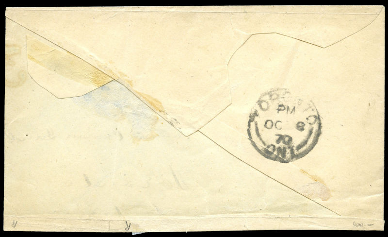 1870 cover, EUGENIA C. W split ring 6 October 1870. straight line, to Toronto, 'PAID 3', 8 OC 70 receiver, trimmed and part of back flap missing.