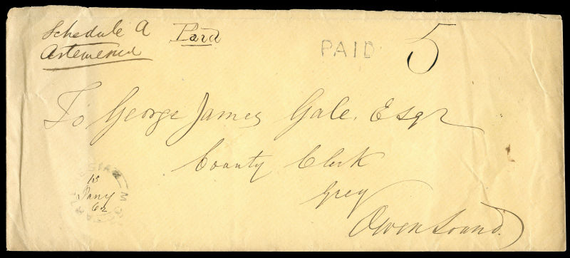 1862 Large cover, ARTEMESIA C.W manuscript 13 Jany 62 double broken circle (LRD), to Owen Sound, PAID hand stamp, manuscript 5, CHATSWORTH U.C 14 JA 1862 transit and large OWNE SOUND same day receiver, cover faults. (Image) (imagea)