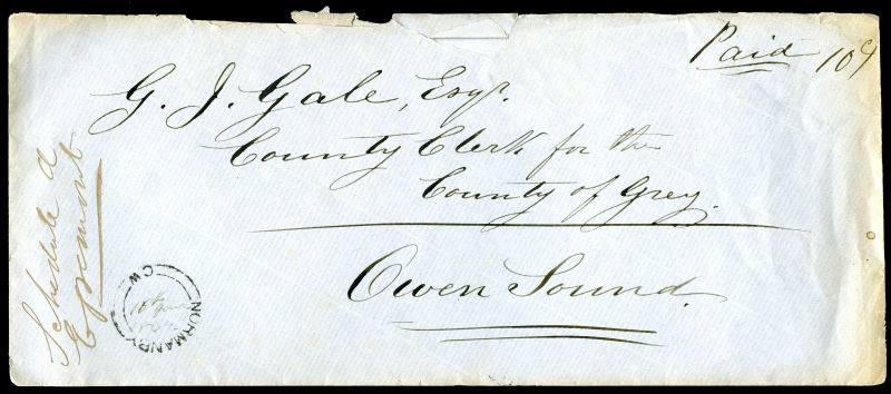 1864 Large cover, NORMANBY C.W manuscript 16th Jany 1864 double broken circle (LRD), to Owen Sound, manuscript Paid 10, large OWEN SOUND 17 (?) 1862 receiver, cover faults. (Image) (imagea)