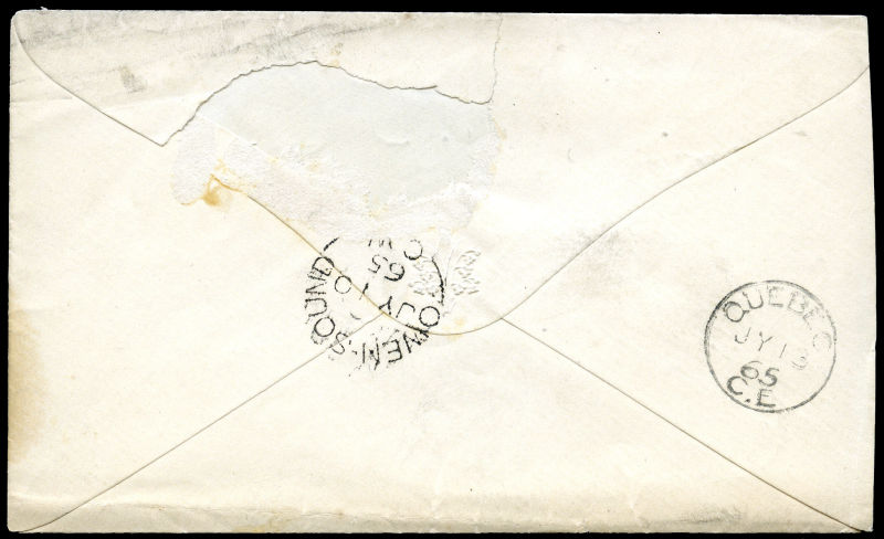 1865 small cover, green ARKWRIGHT C.W 10 JY 65 (ERD) split ring to Quebec, matching green PAID 5 hand stamp, OWEN-SOUND C.W 10 JY 65, and small circle 13 JY 65 C.E receiver, cover faults. (Image) (imagea)