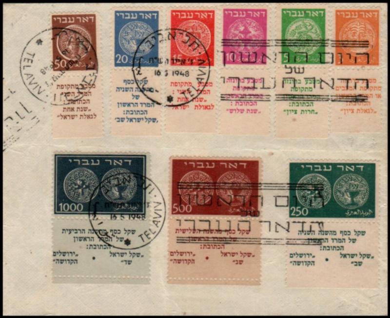 Lot 87 - 1948, DOAR IVRI 3-1000 mils (First Coins 1948 #1-#9 in all catalogues) complete set of 9 singles with full tabs tied to private FDC by 2 complete FD roller cancellations TEL-AVIV 165 1948 with an additional part cancellation on #6. #1 & #3 perforation 10x11, balance perforated 11. Tab types: #1 & #3-1.1: #2, #4 & #6-t.2: #5-t.4. Very fine condition. Photostats. Y. Tsachor Cat $ 5000++. (P).... Currently US$ 3,500