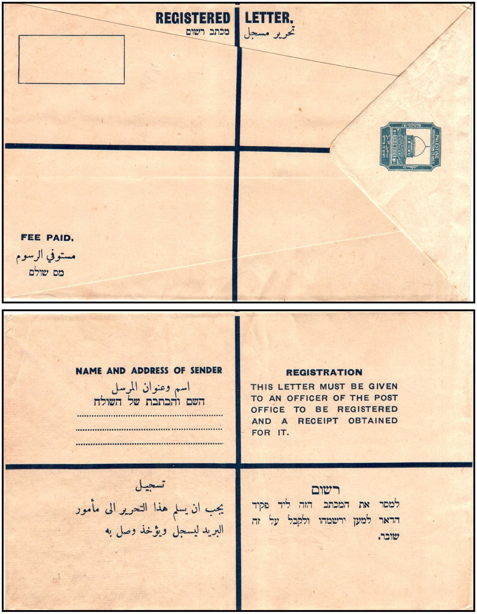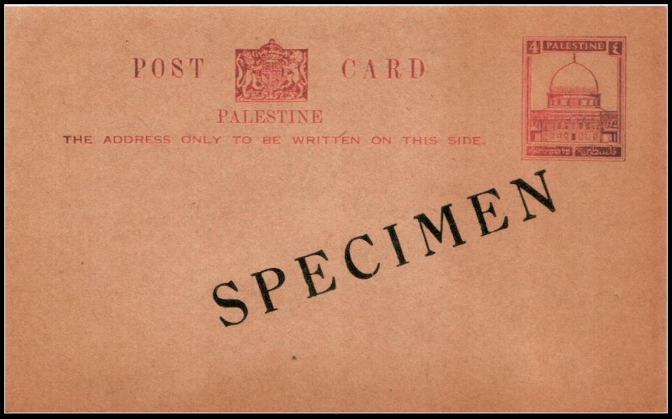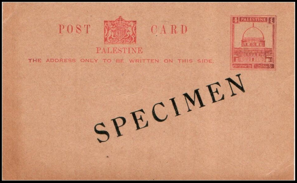 33 Cover , veryfine , postcard   imagePalestine Postal Stationery Card, Bale/Dorfman SPC‑1, 120 × 75 mm, printed in English only, overprinted “SPECIMEN.” Classified in Bale/Dorfman as a specimen card only. A similar example recently sold for over $500, highlighting its rarity and strong collector demand.