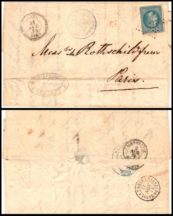 12 Cover , Front Cover , veryfine   imageHoly Land (French Post Office) 1873, cover from Jerusalem to Paris bearing a genuine grey-blue "Jerusalem Cross" postmark of the French P.O. in Jerusalem, black pearl-ring Jaffa/Syrie cancel dated October 31, 1873, and a blue 20c French "Laureé" stamp (Yv. #29) with an illegible numeral cancel. Original single franking was removed and replaced by the blue Laureé stamp, which is not original to the cover. Numerous transit and arrival marks on reverse. Expertized by P.O.B. Tel Aviv (March 18, 1982, H.G. Muentz). Scarce and historically significant.