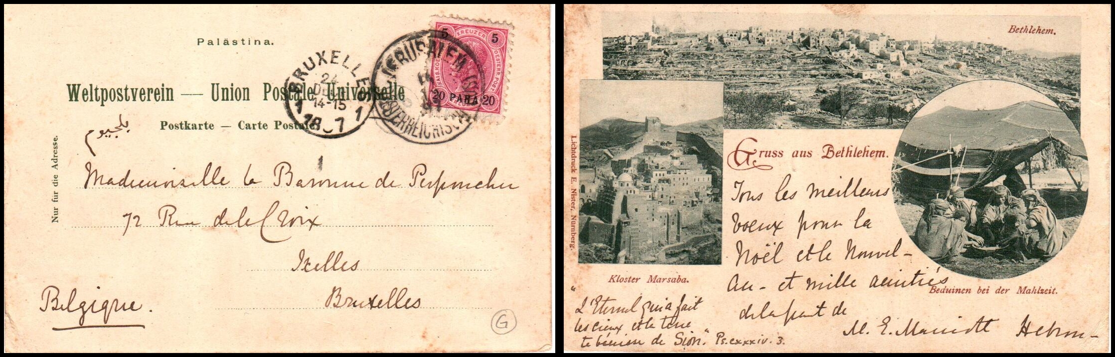 7 Front Cover , veryfine   image1897, postcard from Jerusalem to Brussels, Belgium, franked by a 20para stamp, tied by a strong Jerusalem CDS, also bears a Brussels arrival CDS, the picture side showing views of Bethlehem, Marsaba, and Bedouins