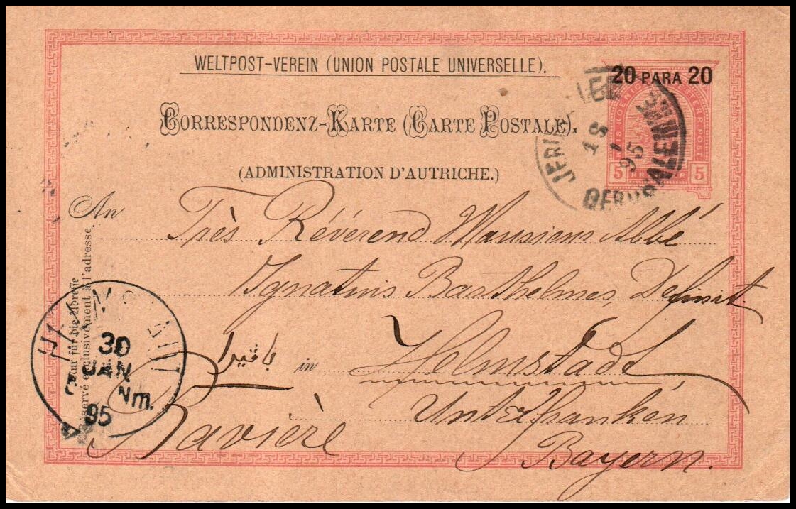 8 Front Cover , verygood   image1895, postcard from Jerusalem - Gerusalem post 18.1.95 to Germany Bavaria, franked by a 20para printed Prepaid, tied by a strong Jerusalem CDS, also bears a Bavaria arrival CDS 30/1/95.Bale: 114.