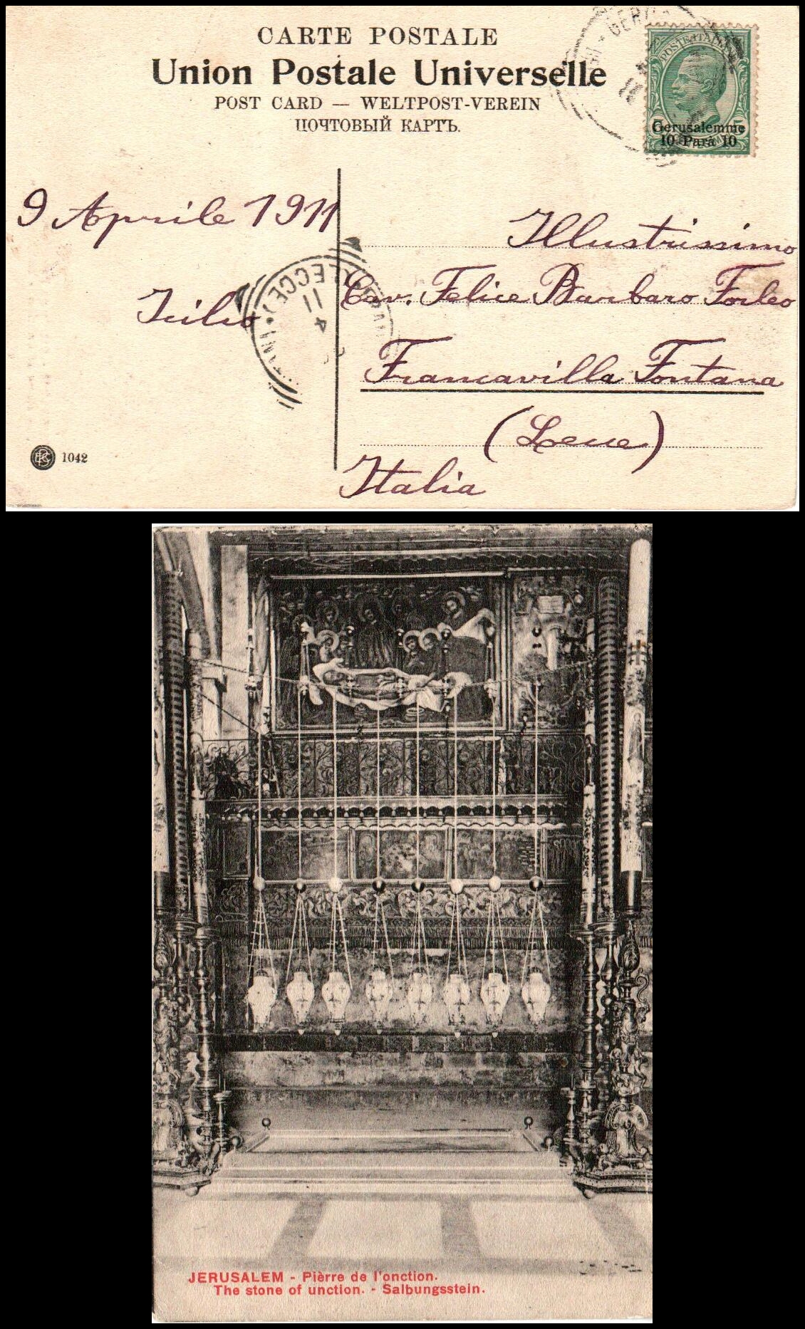 29 Front Cover , verygood   imageItaly Levante Offices in Asia JERUSALEM Card Sent to LECCE 1911 1909-1911 Italian overprint JERUSALEM 10pa on 5c Sassone Cat. 1 Cancelled Jerusalem April 1911 rrival canceled Lecce 1911. F  RARE POSTAGE USE - SASSONE CAT. 2003 CAT. VALUE $475.00