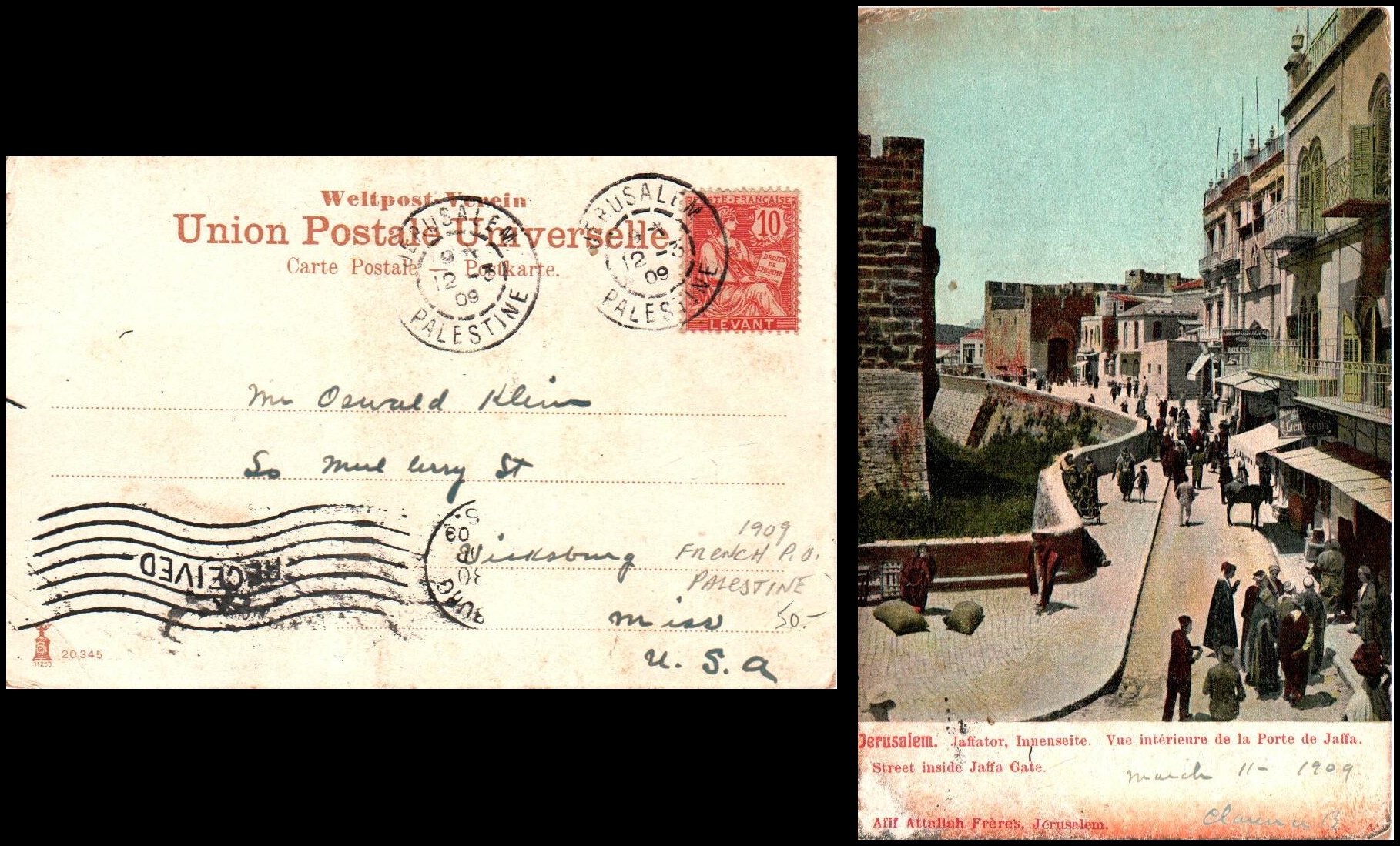 13 veryfine   imageJerusalem - Palestine 12.Mar. 1909 French Post pmk on 'the Entrance Via Jaffa Gate to the Old City of Jerusalem' color ppcd. Address. to the USA.