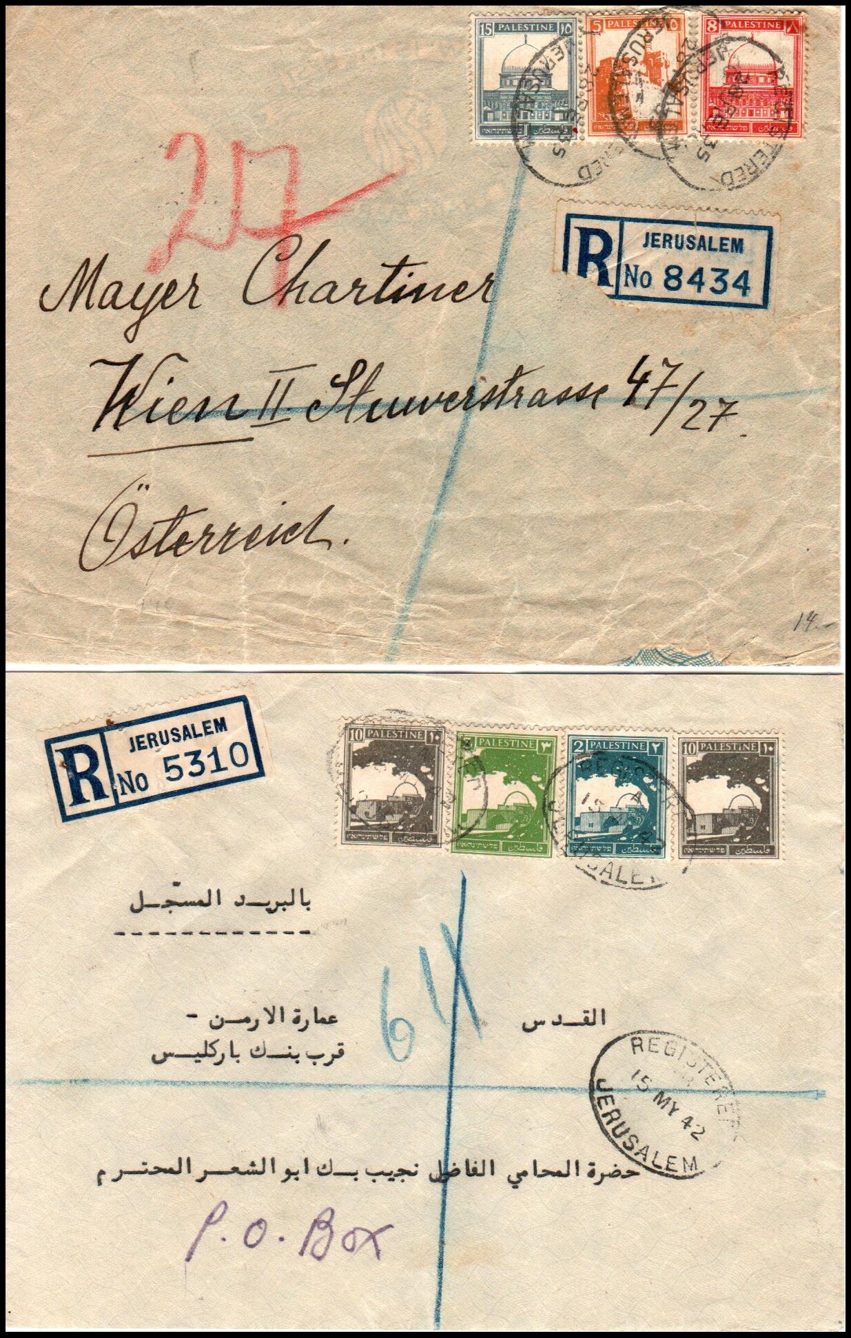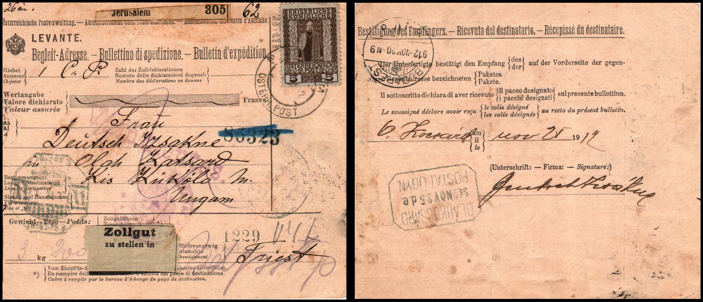 10 veryfine   imageAustrian Post parcel card for 3Kg.  200 grams from Jerusalem to Germany, franked 5 Piastres.  Note the packet label numbered "62". Cat Bal: $500