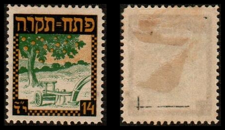 9 Unused , veryfine   imagePetach Tikva Jewish colony 1909 issue stamp, denominated 14 Para (Ba #J-1), MH & OG. This adhesive was used as a surcharge applied to mail for the forwarding fee to the Austrian post office in Jaffa; the Austrian post in the Holy Land exclusively handled mail from the Jewish colonies and settlements. The stamp was in use for only a year, between 1909 and 1910, owing to the disapproval of the Ottoman Turkish authorities, who ordered its usage stopped.