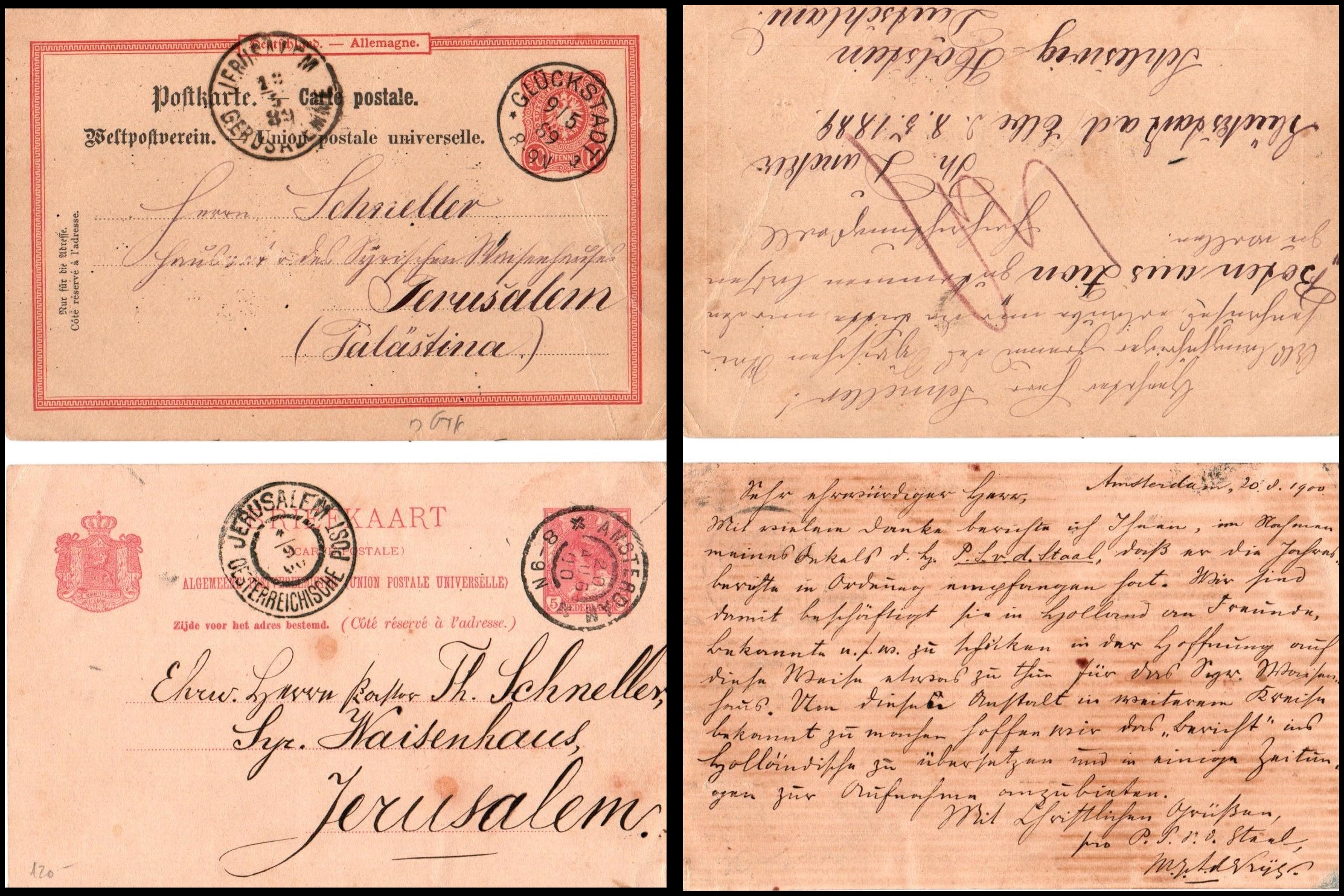 15 Front Cover , veryfine   imageReverend Pastor Th. Schneller, Syrian Orphanage, Jerusalem. Adam, August 20, 1900 Jerusalem Oest. Post, September 4, 1900. Dear Reverend Sir, With many thanks, I report to you, on behalf of my uncle, the H.P.S. v.d.Staal, that he has received the annual reports in good order. We are busy distributing them to friends, acquaintances, etc. in Holland in the hope of doing something for the orphanage this way. To make this institution known to a wider audience, we hope to translate the "Report" into Dutch and offer it for publication in several newspapers. With Christian greetings, the pro.P.S. v.d.Staal Amsterdam, August 20, 1900. Mr. A. de Vries Include post postcard from Glockstadt, Germany, 1989  “Jerusalem - Palestine” arrival CDS,
