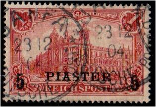 16 Used , veryfine   image1900 5 Pia. on 1 Mk. in overprint type II, with PLF "color line from the right window to the right edge of the picture", clean cancelled "Smyrna 30 / 11.04", photo-certificate by Jäschke-L. "... in flawless condition" (Mi. approx. 3.000, -)