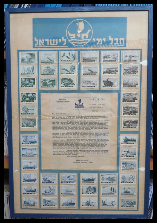 213 Without gum , Sheet Letter   imageISRAEL MARITIME LEAGUE 1946 COMMEMORATIVE SHEET – 48 STAMPS A remarkable full sheet of 48 stamps issued by the Israel Maritime League, featuring a central imprint dated 27 May 1946. The text emphasizes the League’s mission: “THE LEAGUE AIMS TO FURTHER ALL JEWISH MARITIME ACTIVITIES IN ERETZ-ISRAEL” and includes contact details for the Cape Town Committee and the Head Office in Tel Aviv, then part of Palestine. Addressed to Jewish youth, the message invites boys and girls to explore the rich maritime history and traditions of the Jewish people—interrupted but now being revived in Eretz-Israel. It encourages engagement with sea cadets, fishermen, shipping companies, and aquatic sports, reflecting the League’s dedication to promoting maritime activities in the Jewish homeland.