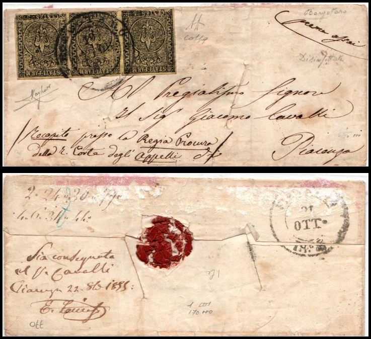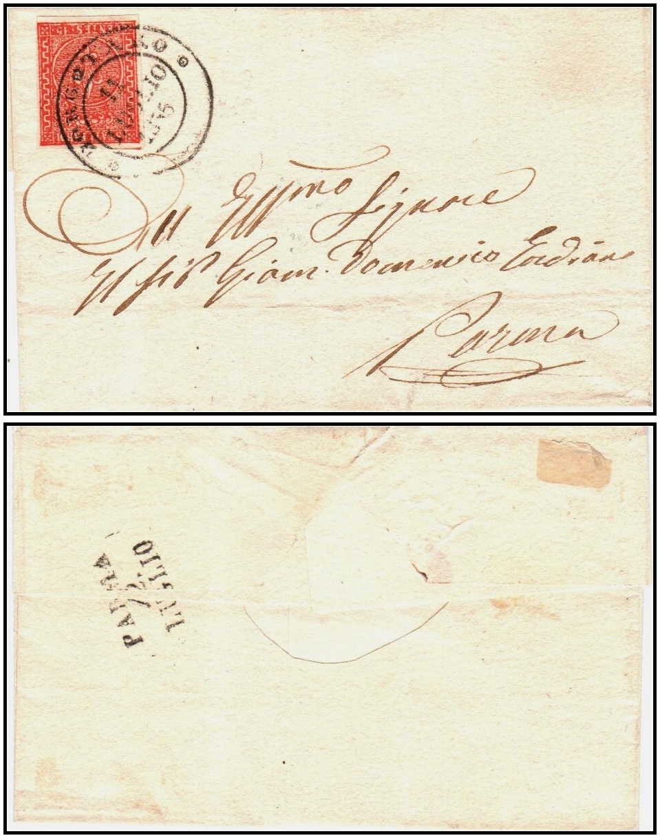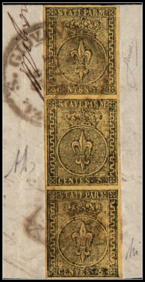 447 Cover , Used   imageDuchy of Parma – 1855 Cover to Piacenza with 1852 5c Yellow-Green, Sassone #8Folded entire sent from Borgotaro to Piacenza, dated 19 October 1855, franked with a horizontal strip of three 5 centesimi yellow-green (giallo chiaro/verdone), tied by circular postmarks.A fine and rare franking, bearing disinfection slits typical of the period.Accompanied by a 2001 certificate from Giorgio Colla, who confirms the authenticity of the letter, strip, and cancellations, and notes the excellent condition aside from the slits.A very scarce and attractive item of classic Italian postal history.