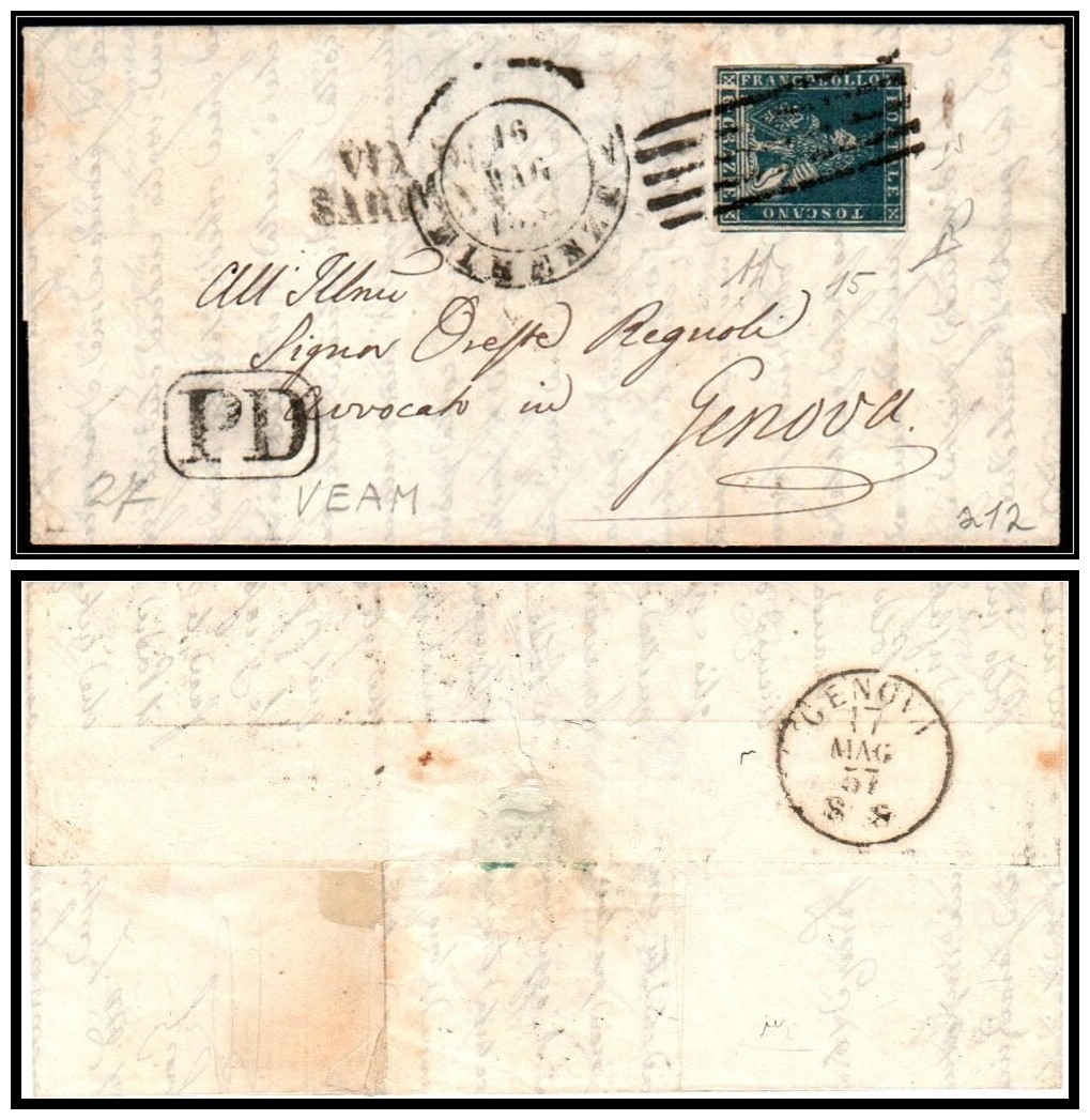 451 Cover , veryfine   imageITALIAN STATES – TUSCANY. 1857 (May 16) Folded letter from Firenze to Genova, franked with 6 crazie green on grey-blue (MiNr. 7y), tied by clear 5-bar grill cancel. Marked with boxed “P.D.” and two-line “VIA DI SAR” handstamp, indicating routing via the Kingdom of Sardinia. Backstamped with Genova arrival dated 17 May 1857. Signed Avanzo.