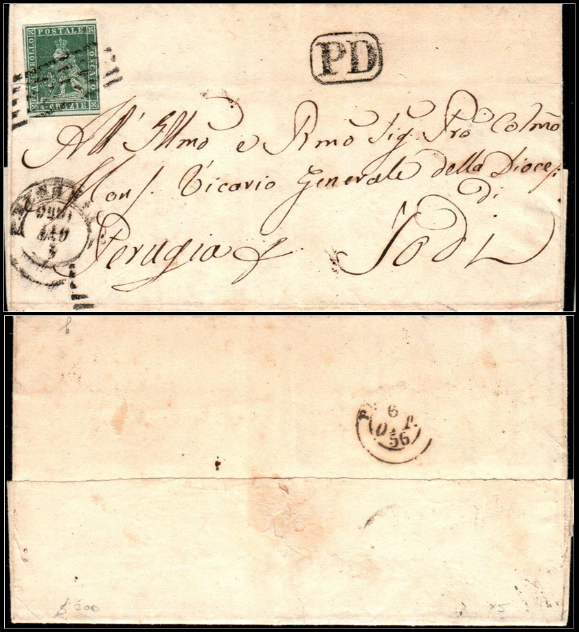 452 Cover , veryfine   imageITALIAN STATES – TUSCANY, 1856: Cover from Florence to Lodi (Perugia), franked with 4 crazie green on grey (Sassone 7, MiNr. 6xb, first printing), tied by 5-bar mute cancel. Stamp with ample to wide margins. Clear boxed “P.D.” in black and well-struck departure and arrival date stamps. Addressed to the Vicar General of the Diocese of Perugia. A fresh and attractive cover. Cat. €200. Very Fine.