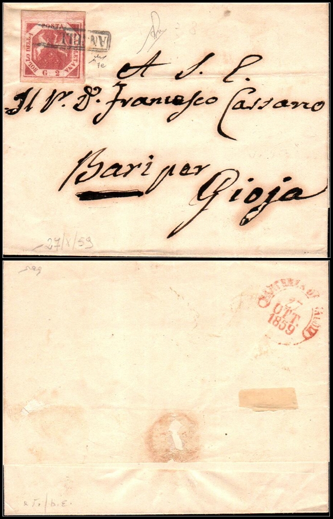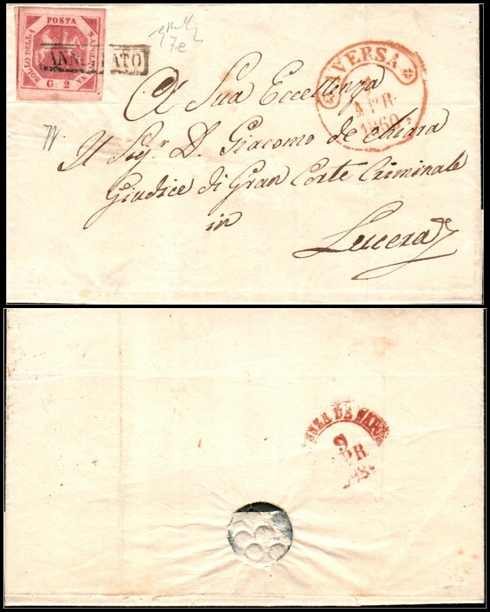 443 Cover , veryfine   imageItalian States – Naples, 1859 (April). Envelope to Lucera, addressed to “Sua Eccellenza Il Sig. D. Giacomo de Chiari, Giudice di Gran Corte Criminale”, franked at right with 2 grana pinkish brown (Sassone 7e), which bears the Surány certificator’s signature along with the Sassone catalogue number. The stamp is cancelled by boxed “ANNULLATO” in black. At right, alongside the franking, fine strike in red of circular datestamp of Aversa with three-line date “APR 1859”; reverse with similar circular arrival datestamp of Lucera.