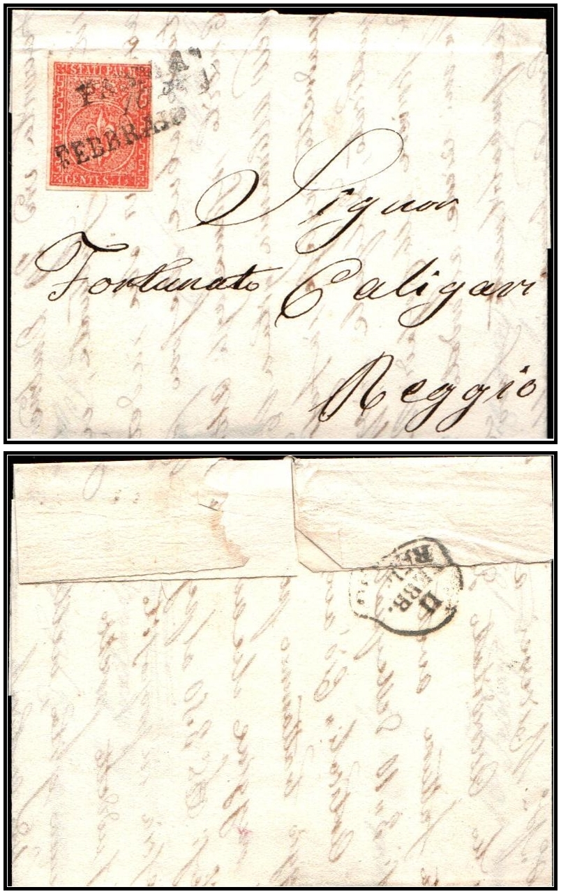 449 Used , veryfine , Shana Tova   imageItalian States: Parma, 1854, 15c red (Scott 7, MiNr. 3 ), tied with 3-line hand-stamp on folded letter  “PARMA/ 20/ FEBBRAJO”, addressed to  "Fontanato Caligaur Reggio," indicating its destination as Reggio, which could refer to Reggio Emilia or Reggio Calabria in Italy.   with receiving postmark, Very Fine.Sassone 7; €750 ($1,000).Scott $425.Estimate $300 - 400.